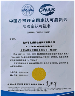 2021年9月8日,北京軍友誠(chéng)信檢測(cè)認(rèn)證有限公司(以下簡(jiǎn)稱公司)正式獲得中國(guó)合格評(píng)定國(guó)家認(rèn)可委員會(huì)(CNAS)授予的實(shí)驗(yàn)室認(rèn)可證書,同時(shí)也通過(guò)了國(guó)防實(shí)驗(yàn)室(DiLAC)認(rèn)可,這表明公司檢測(cè)的技術(shù)能力和管理水平均達(dá)到認(rèn)可準(zhǔn)則要求,并正式成為具備國(guó)際互認(rèn)資格的檢測(cè)實(shí)驗(yàn)室。