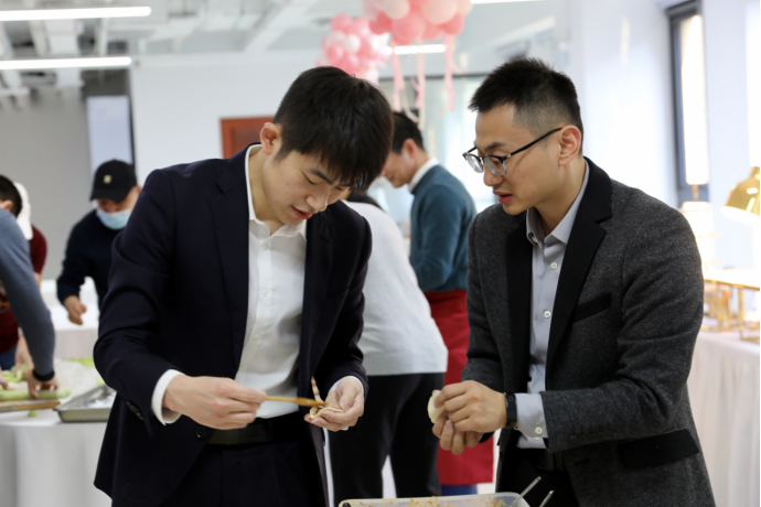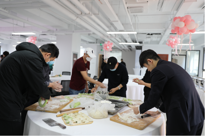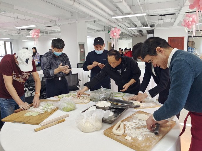 在活動現(xiàn)場公司男同志們主動走進廚房,紛紛大顯身手,親自掌廚,展示自己的精湛廚藝,大家圍在一起有人和面、有人搟餃子皮、有人添餡捏邊,每一個步驟,每一個動作,都透露著對女職工的祝福,歡樂的氛圍充斥著整個大廳。