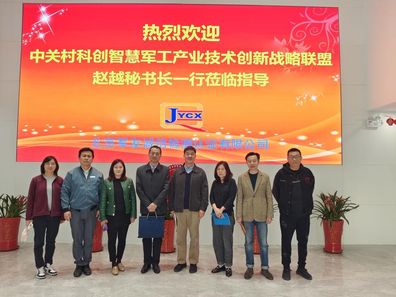 3月31日,中關村科創(chuàng)智慧軍工產(chǎn)業(yè)技術創(chuàng)新戰(zhàn)略聯(lián)盟秘書長趙越、副秘書長張中輝等一行4人到北京軍友誠信檢測認證有限公司(以下簡稱“軍友誠信”)調(diào)研。參觀公司辦公樓和展廳,觀看了軍友誠信成立20周年宣傳片,并進行了座談交流。軍友誠信書記趙顯立、副總經(jīng)理鄭燕及主要部門領導陪同參觀并參加座談交流。