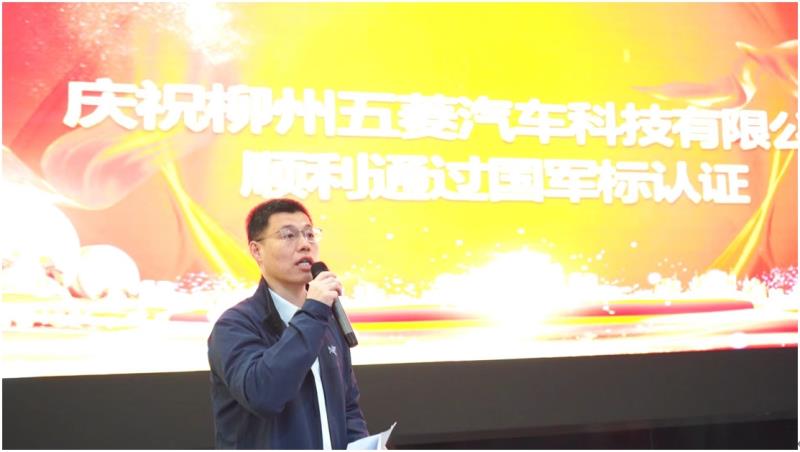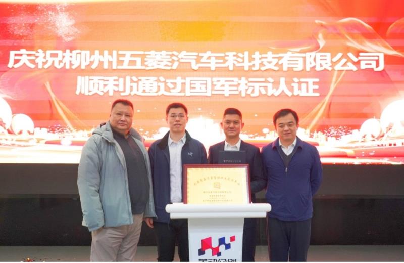 2024年3月4日,柳州五菱汽車科技有限公司(以下簡稱五菱科技)舉辦了武器裝備質量管理體系認證證書授牌儀式。北京軍友誠信檢測認證有限公司(以下簡稱軍友誠信)周濤總經(jīng)理、謝志磊副總經(jīng)理,廣西汽車集團有限公司陳曉峰副總裁,柳州五菱汽車科技有限公司田留勝總經(jīng)理、廖睿副總經(jīng)理出席會議。軍友誠信周濤總經(jīng)理為五菱科技頒發(fā)了武器裝備質量管理體系認證證書和銅牌