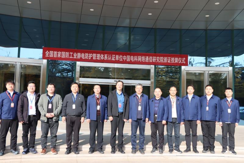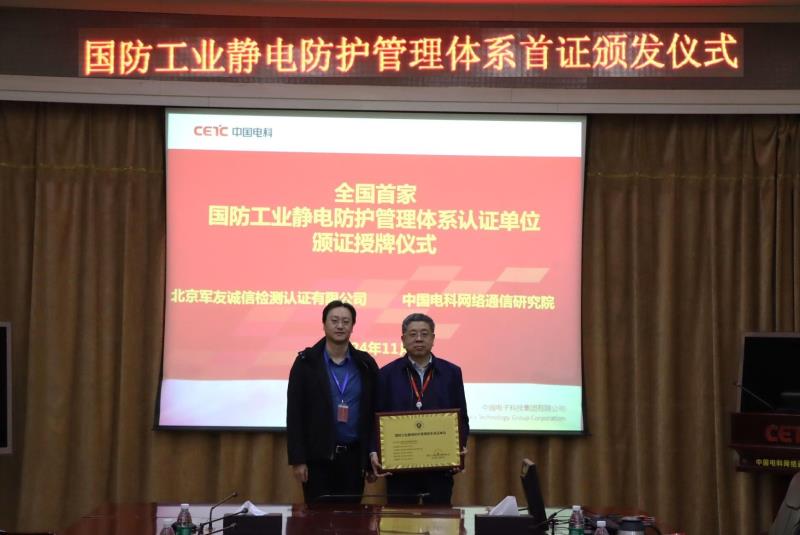 2024年11月20日,國防工業(yè)靜電防護(hù)管理體系證書由北京軍友誠信檢測認(rèn)證有限公司(簡稱:軍友誠信)正式頒發(fā)給中國電科網(wǎng)絡(luò)通信研究院(中國電子科技集團(tuán)公司第五十四研究所,簡稱:網(wǎng)通院)。中電網(wǎng)絡(luò)通信集團(tuán)有限公司副總經(jīng)理、網(wǎng)通院總監(jiān)王光明,軍友誠信副總經(jīng)理張恩澤,國防工業(yè)靜電防護(hù)管理體系認(rèn)證專門委員會(huì)秘書長張京燾(軍友誠信),航天514所及網(wǎng)通院質(zhì)量管理部、裝備制造部等領(lǐng)導(dǎo)專家出席了頒證儀式。